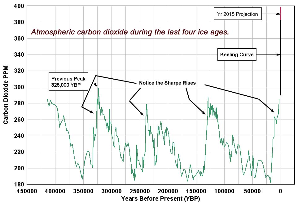 Ice cores samples can reveal the Earth's natural climate rhythm over the last 800,000 years. When carbon dioxide levels changed there was always an accompanying climate and sea level change. Past measurement can be observed from Arctic and Antarctic ice. These cores show that carbon dioxide was always between 180 parts per million (ppm) and 300 ppm during the past 800,000 years. However, now it is 389 ppm (when I first wrote this article in 2009 ... in Oct 2018, it was up to 409 ppm, an increase of 20 ppm in 9 years!) and steadily increasing at a rate of nearly 2 ppm a year. Present CO2 concentrations are higher now than any time in the last 800,000 years. The bulk of this carbon increase is from the burning of coal, oil and natural gas, mainly used in the generation of electricity.