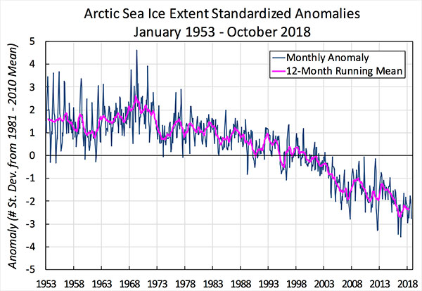 Mean sea ice anomalies, 1953-2009: Sea ice extent departures from monthly means for the Northern Hemisphere. For January 1953 through December 1979, data have been obtained from the UK Hadley Centre and are based on operational ice charts and other sources. For January 1979 through 2012, data are derived from passive microwave (SMMR / SSM/I). Image by Walt Meier and Julienne Stroeve, National Snow and Ice Data Center, University of Colorado, Boulder.