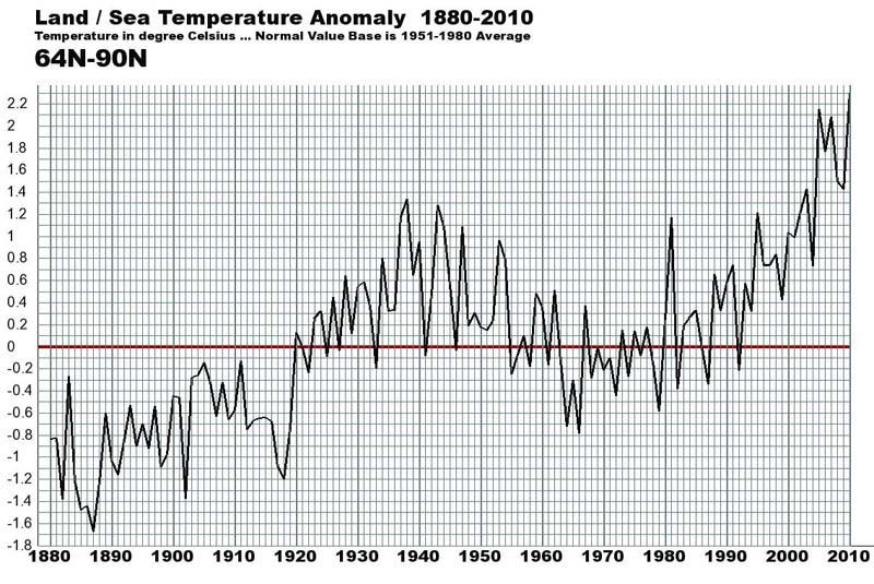 Notice that there is a fuzzy relationship to yearly temperature with the average 11 year solar cycle. As the solar cycle decreases to its minimum sunspot activity, resulting in a slight decrease in solar energy reaching the earth, the global average temperature also drops. Likewise, when the sunspot activity rises to its solar maximum, resulting in more solar energy reaching the earth, the global temperature also rises. However, the solar rise and fall is nearly constant, but the average global temperature is slowly rising, but more dramatically in the Polar Regions. This polar amplification could be the result of the decrease in albedo (reflectivity) with more water and land being exposed from the decrease in the ice cover.